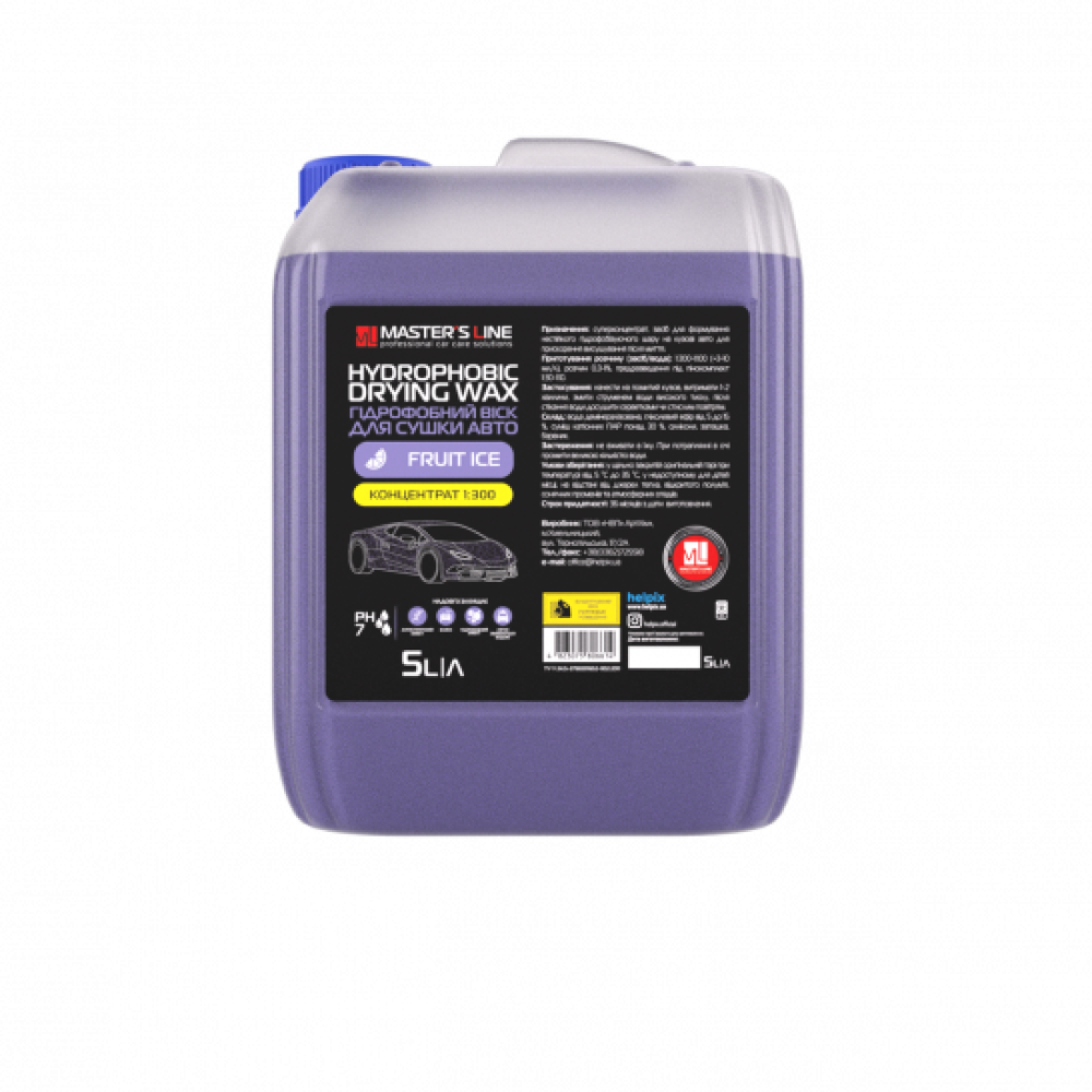 Призначення: висококонцентрований гідрофобний засіб для тривалої консервації поверхні автомобіля після мийки. Завдяки високому водовідштовхувальному ефекту, забезпечує швидке висихання поверхні авто, створює антистатичний ефект, утворює тонку захисну плівку. Надовго захищає оброблену поверхню від від проникнення води, бруду та впливу зовнішнього середовища, має ефект самоочищення. Надає глибокого блиску. Має приємний аромат «Fruit ice».