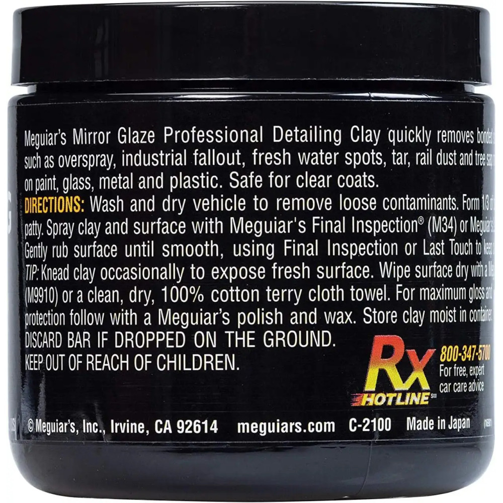 Очисна глина Meguiar's C2100 застосовується для видалення будь-яких забруднень з поверхні кузова автомобіля. Глина на 100% не абразивна та не становить ризику на будь-яких типах лакофарбових покриттів. Чудово підходить для очищення кузова перед нанесенням антигравійної плівки, поліруванням та іншого.